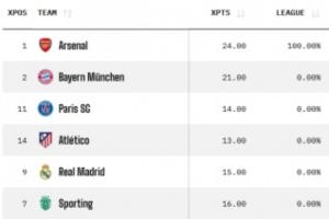 Opta超算给出了最新的欧冠夺冠概率,目前阿森纳34.34%居首,拜仁第二,巴黎和马竞分列三四,皇马仅3.48%位居第五。