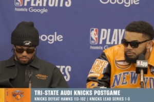 体育资讯4月19日讯 NBA季后赛东部首轮G1,尼克斯113-102战胜老鹰。赛后,布伦森和唐斯接受媒体采访,以下为采访全文。