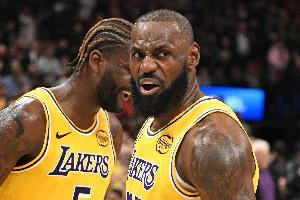 湖人首发:詹姆斯、八村、艾顿、拉拉维亚、肯纳德。